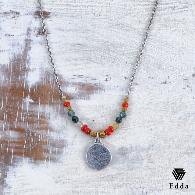 アフガニスタンのアンティークビーズとギリシャのアンティークコインを精巧に復元したレプリカコインが大人の雰囲気のネックレス。神とも崇められる人面牛を意味するギリシャ文字が刻み込まれたコインは、人の目を惹きつけて止まないミステリアスな印象。カラフルでも派手になりすぎないアンティークビーズとチェーンの組み合わせもお洒落。