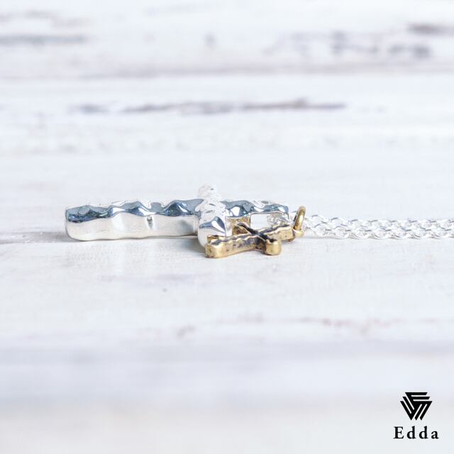 Eddaらしいフォルムのビッグサイズクロスペンダント。ブラスのクロスチャームを合わせることによりデザインに